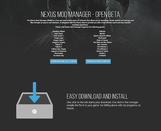 安裝 Nexus Mod Manager,從 Nexus Mods官網(https://www.nexusmods.com/skyrim/mods/ modmanager)下載(WIN 10, 8, 7, VISTA)。